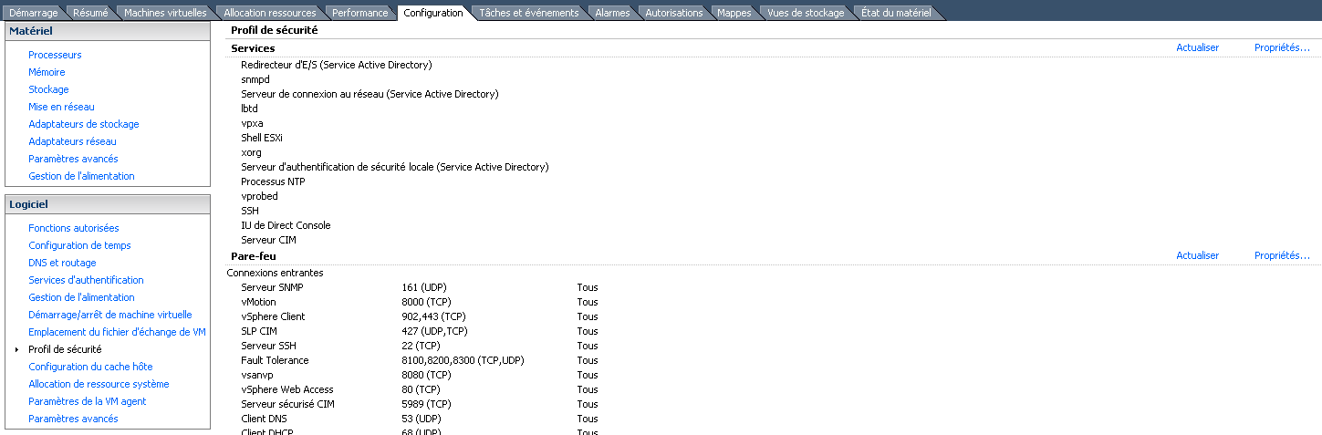 Dans VSphere Client, sélectionner l’hôte qui va être mis à jour et aller dans « Configuration » et « Profil de sécurité »